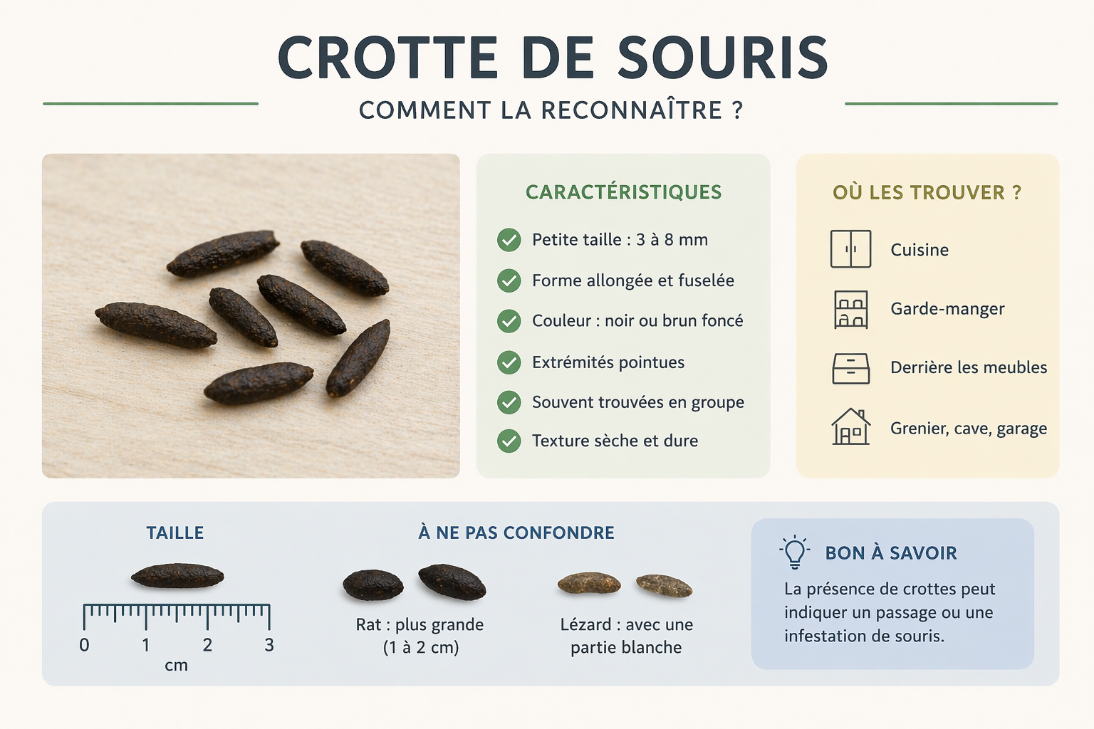 | Souris | 3 à 8 mm | Allongée, pointue | Noir brillant à gris mat, en petits groupes |