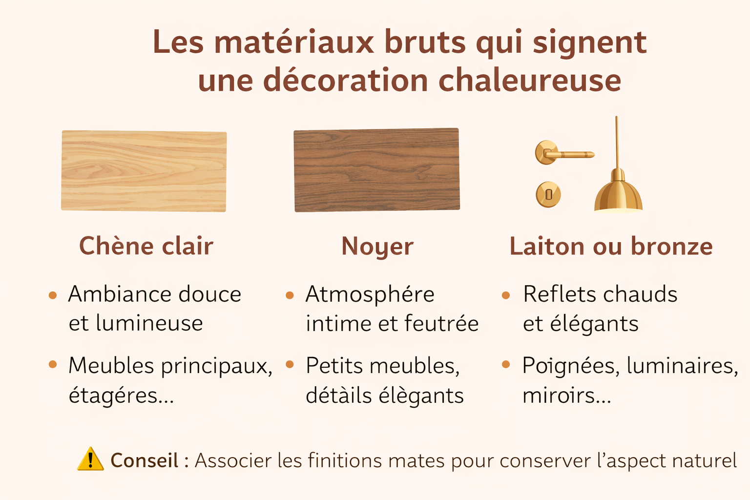 | Noyer | Atmosphère intime et feutrée | Petits meubles, piétements, détails décoratifs |