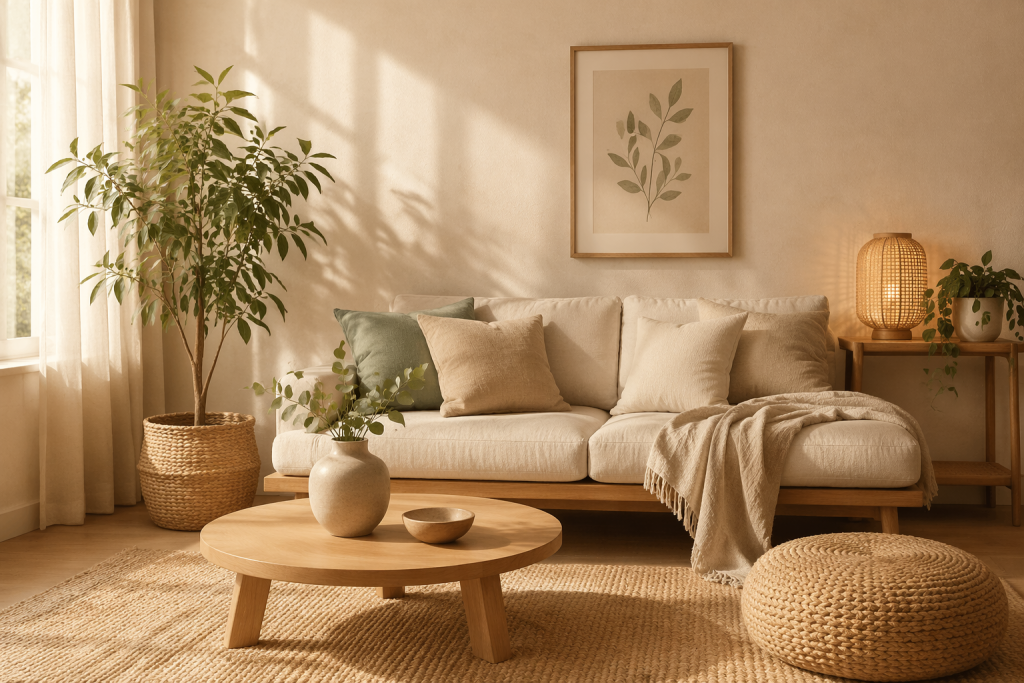 Beige Chaleur discrète, ambiance rassurante Canapé, tapis, coussins