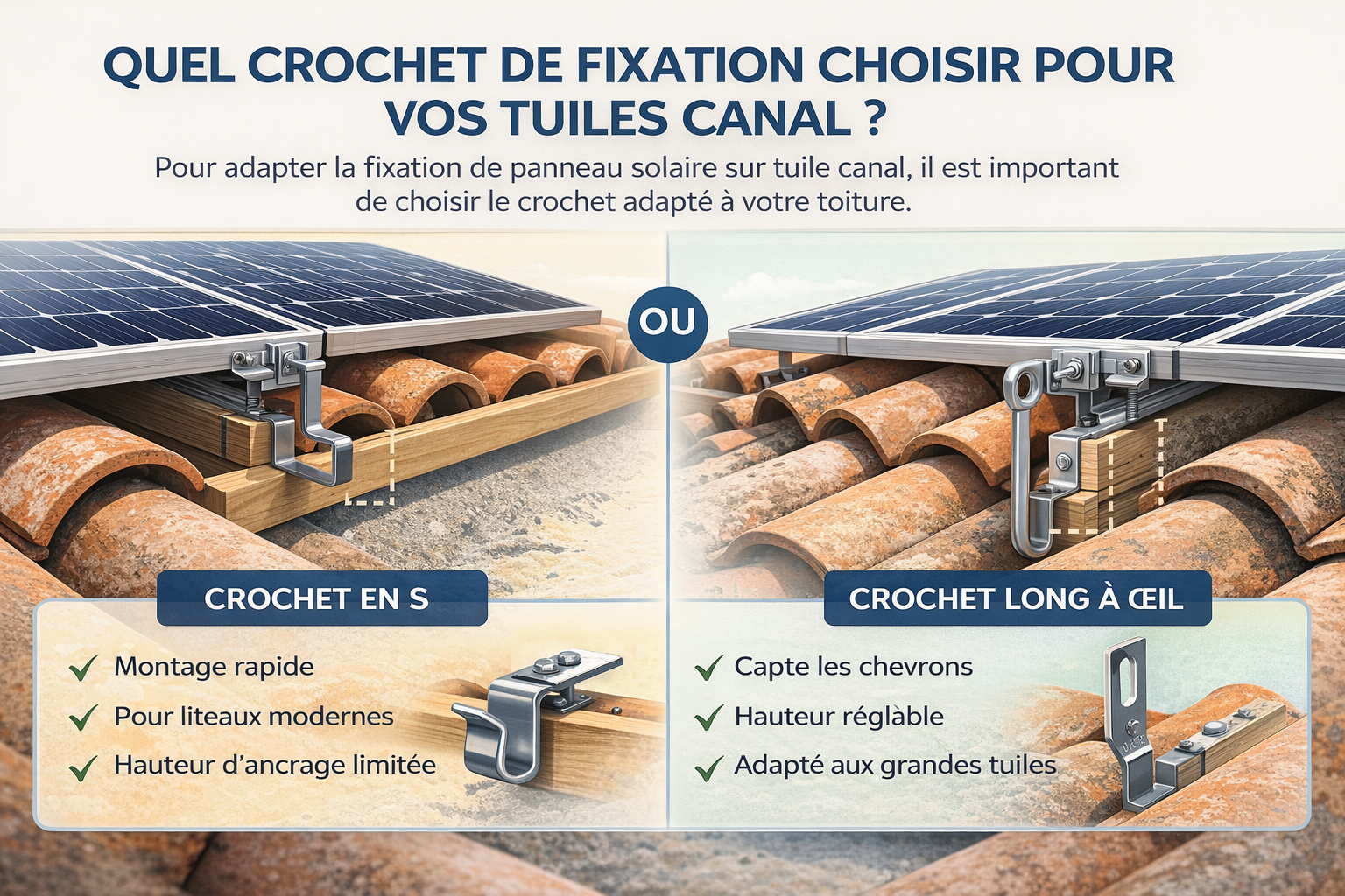 Le choix du crochet dépend surtout du profil de la tuile et du support situé dessous. Sur une tuile canal, on rencontre souvent deux solutions : le crochet en S et le modèle long à œil. Le premier s’adapte bien à certains galbes et à des configurations simples. Le second offre plus de latitude quand il faut rattraper de la hauteur ou venir chercher un point de fixation plus précis dans le chevron.