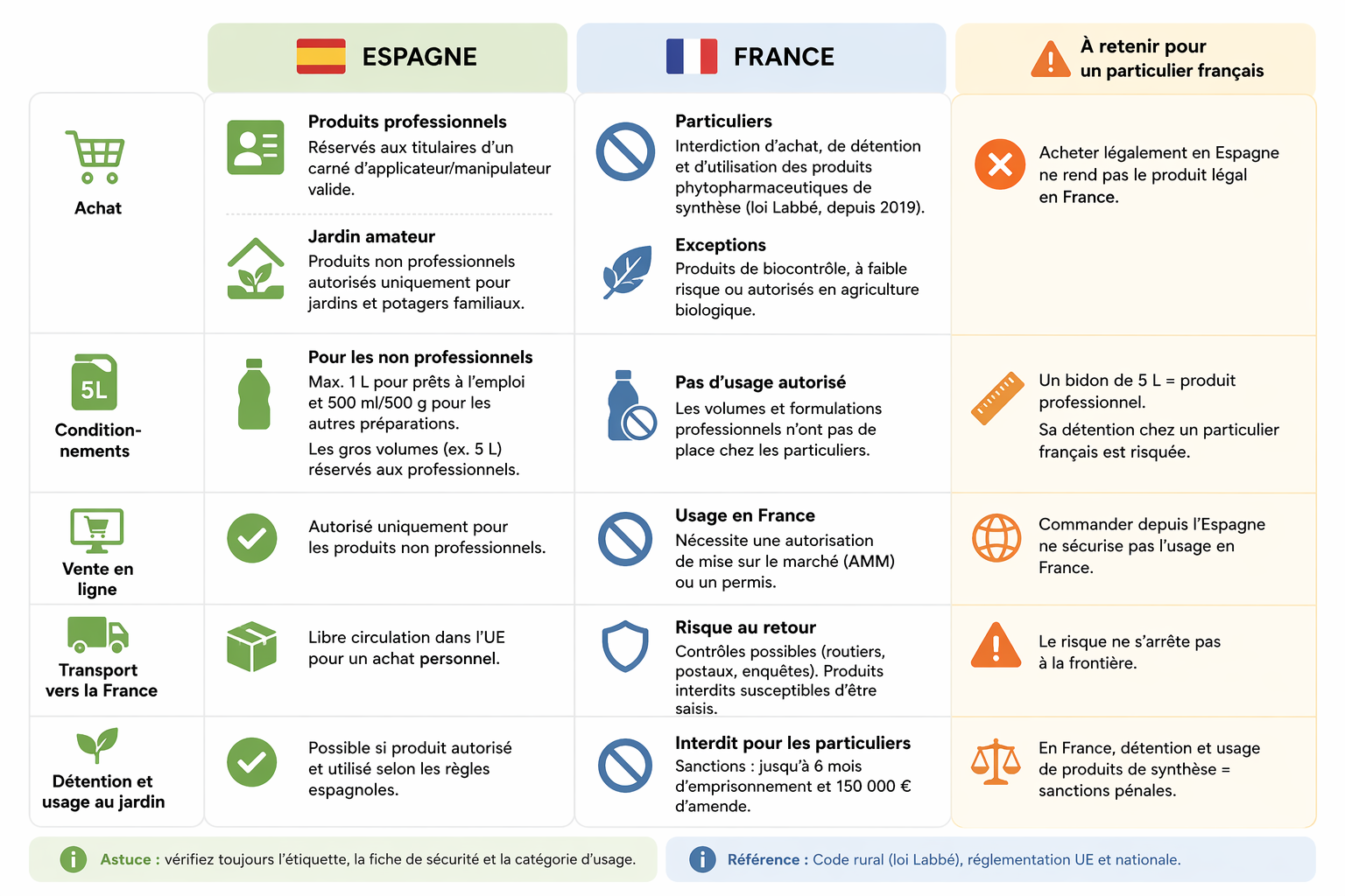 | Détention et usage au jardin | Possible seulement dans le cadre autorisé par le droit espagnol et selon la catégorie du produit. | Interdit aux particuliers pour les produits de synthèse concernés depuis 2019. | Le simple stockage chez soi peut déjà poser problème. |