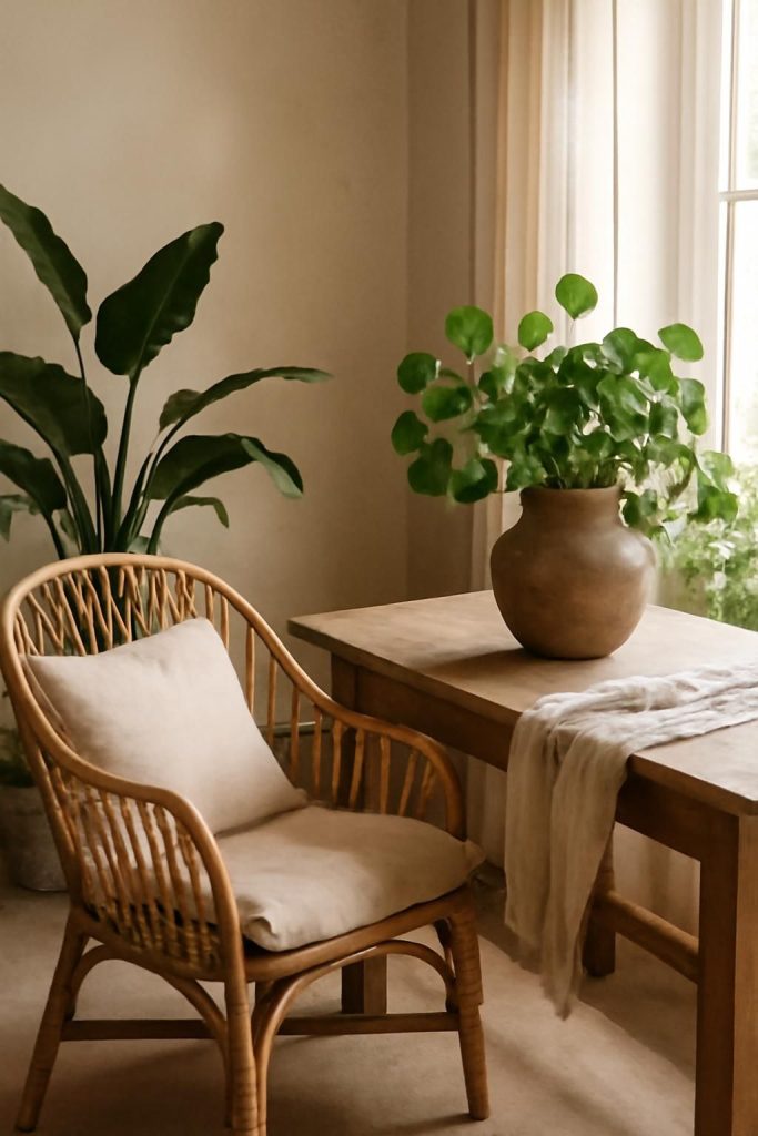 Ce mélange associe lignes épurées et matériaux chaleureux. Il privilégie des palettes terreuses, des volumes clairs et des textures organiques. Un salon peut ainsi marier une table basse en bois massif et un fauteuil rotin sans rupture stylistique.