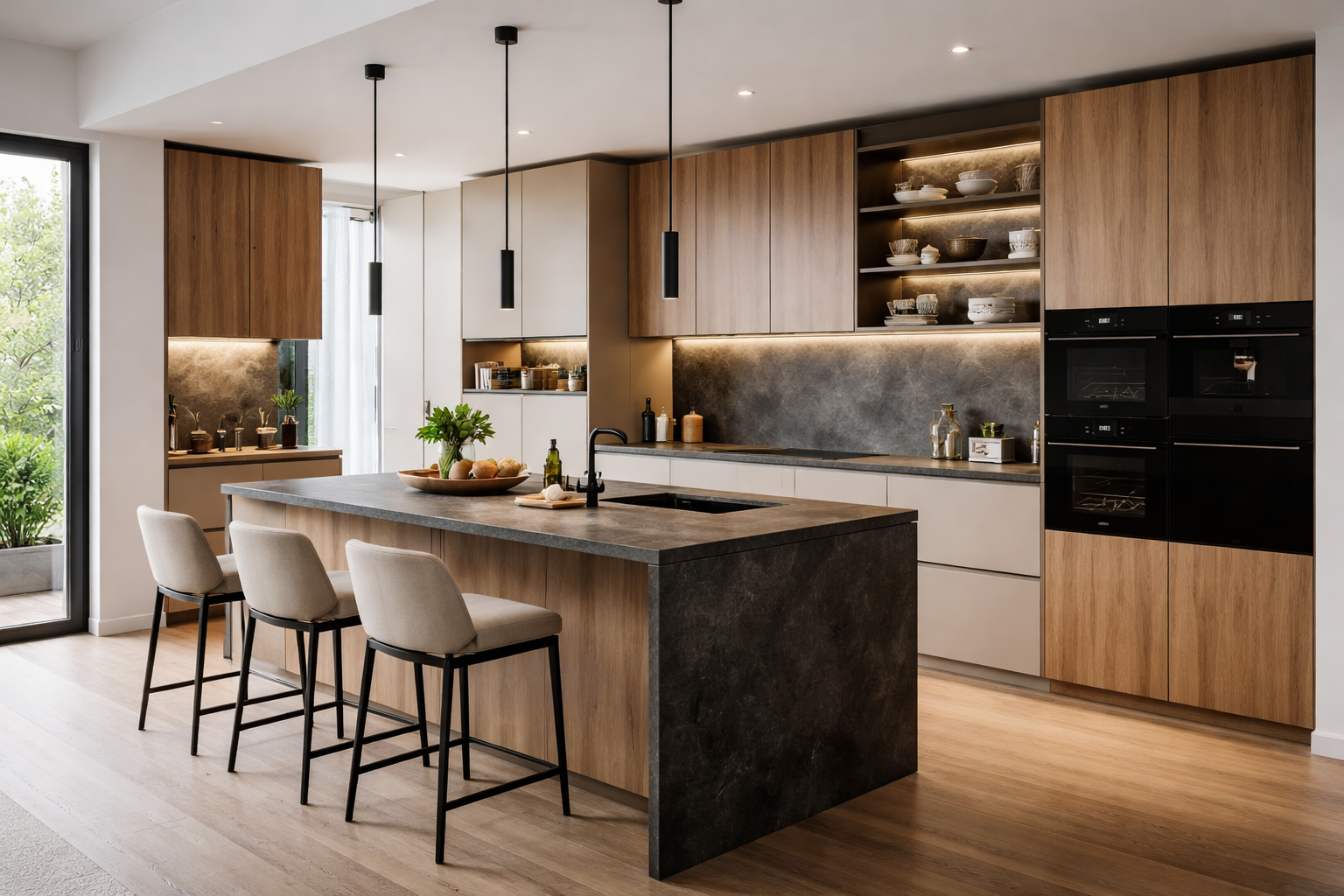 Le bois clair garde une place forte, car il réchauffe les compositions mates et dialogue bien avec les surfaces minérales. On voit aussi revenir les contrastes subtils entre métal noir ou laiton brossé et façades douces, ainsi que le jeu entre surfaces ultra mates et matières plus texturées.
